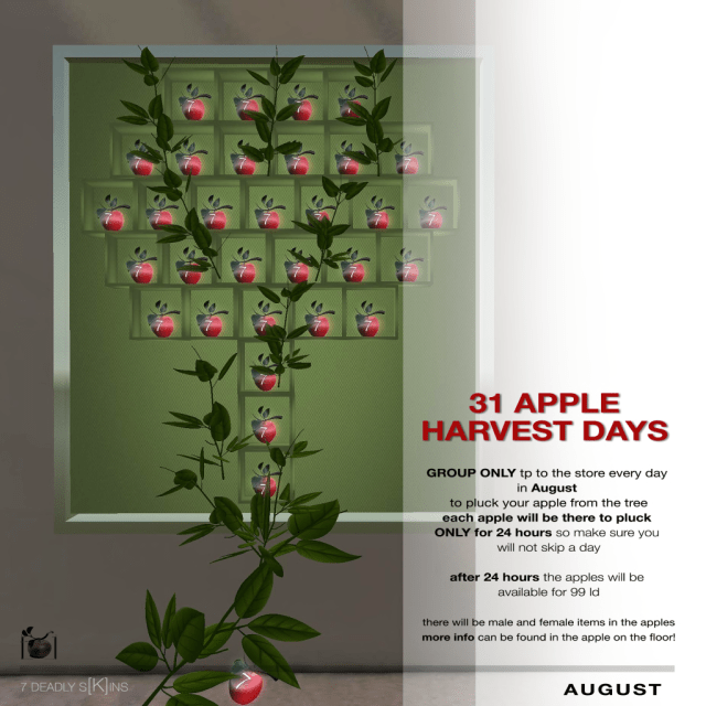 Izara Zuta of 7 Deadly s[K]ins is always generous with her group gifts, but August will be a little different, there is a tree in store, and for each day in August, you can visit and click an apple and get a gift each day. You need to be a group member to participate, it is currently L$225 to join.