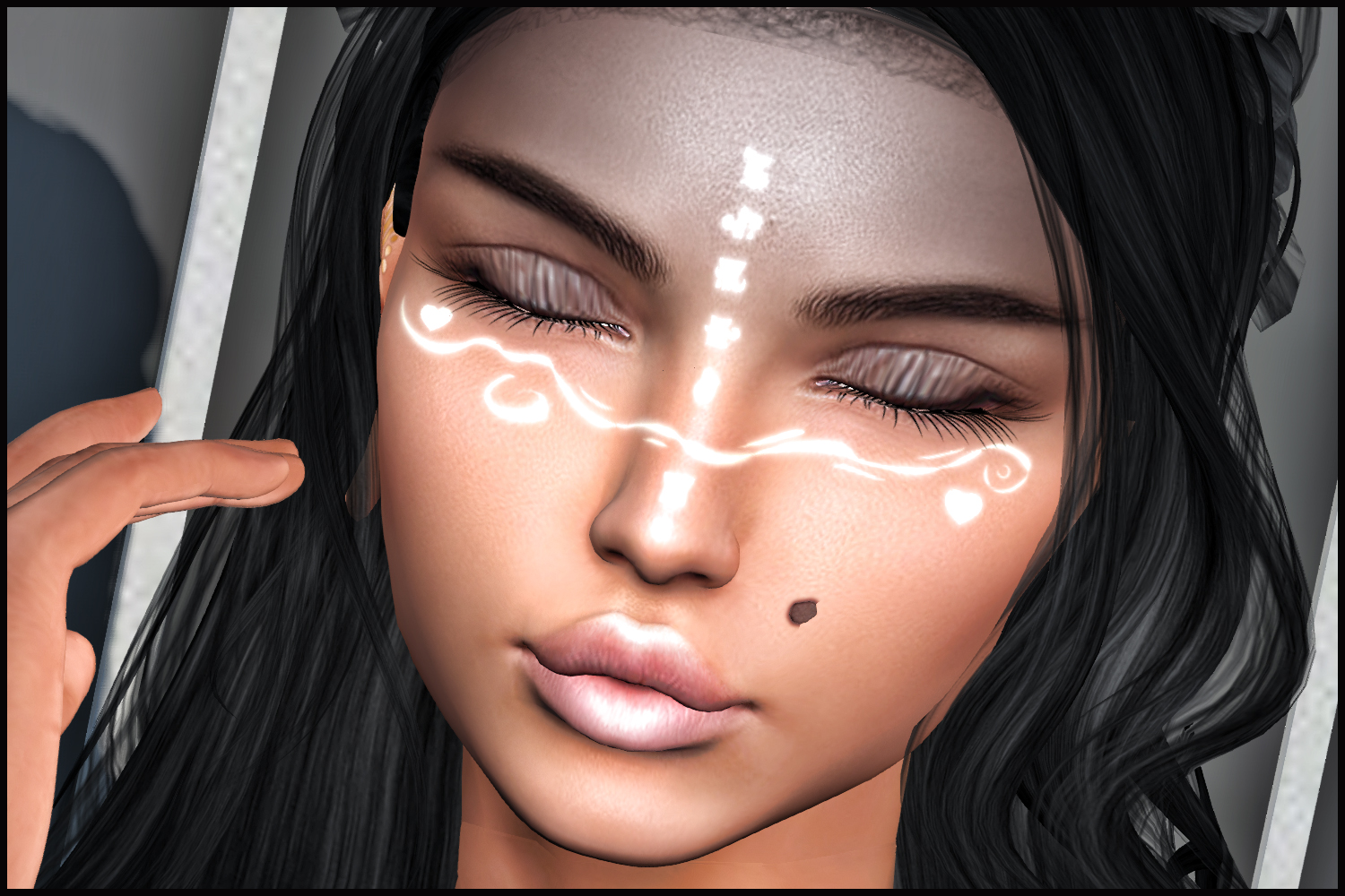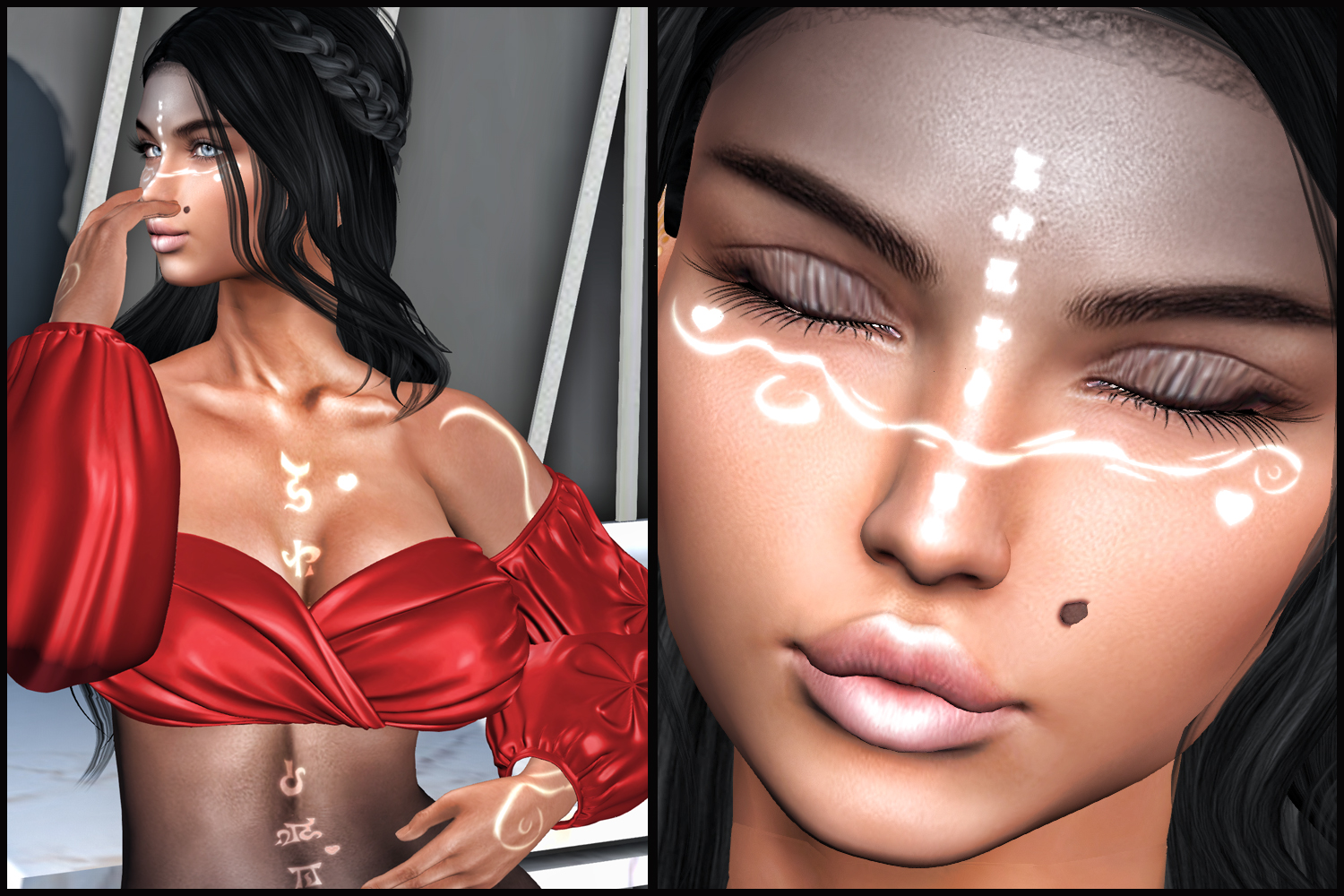 (Not enough space for me to go on about this amazing event.) ‘PENELOPE’ fantasy appliers for women. A more natural skin toned paired with the black. Swirls, emblems and glow on the face, coming with and without makeup options. Hearts, more ornate and feminine, dappling the body’s design, flesh coloured middle with dark scalp and lower body